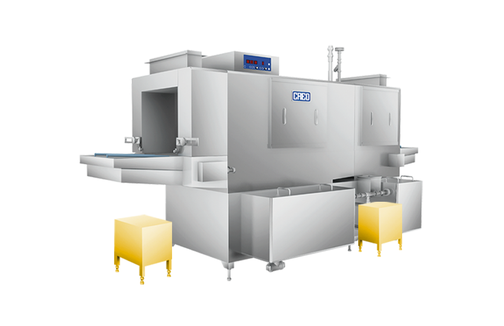 パン製造などで使用する天板、ドウボックス、飲料業界で使用するクレートなど、様々なモノの洗浄について解説しています。