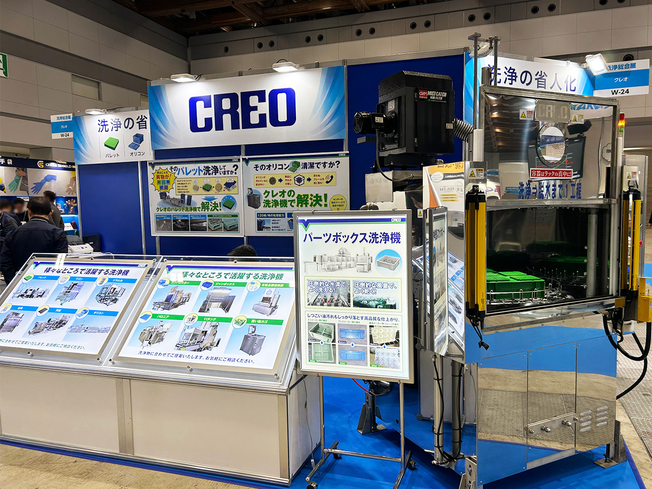 今回弊社ブースでは、自動車業界の部品箱や、その他さまざまな洗浄における「省人化」をメインテーマに、