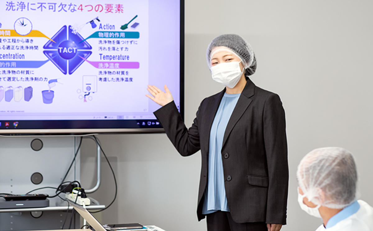 現在の業務は、大きく分けて二つあります。一つ目は、個別ユーザーへの営業支援です。営業担当に同行して商品説明を行うほか、お客様の設備を使用した洗浄評価の実施、洗浄に関する講習会の開催、洗浄マニュアルの作成などを担当しています。二つ目は、当社で扱う洗浄剤などの商品情報の収集・管理・社内共有です。当社では複数の企業から洗浄剤を仕入れているため、各社で評価基準が異なります。そのため、商品の成分や性能に関する情報を収集し、必要に応じて自社で実験を行い、結果を資料としてまとめて社内に展開しています。また、カタログやSDSなどの作成も担当しています。