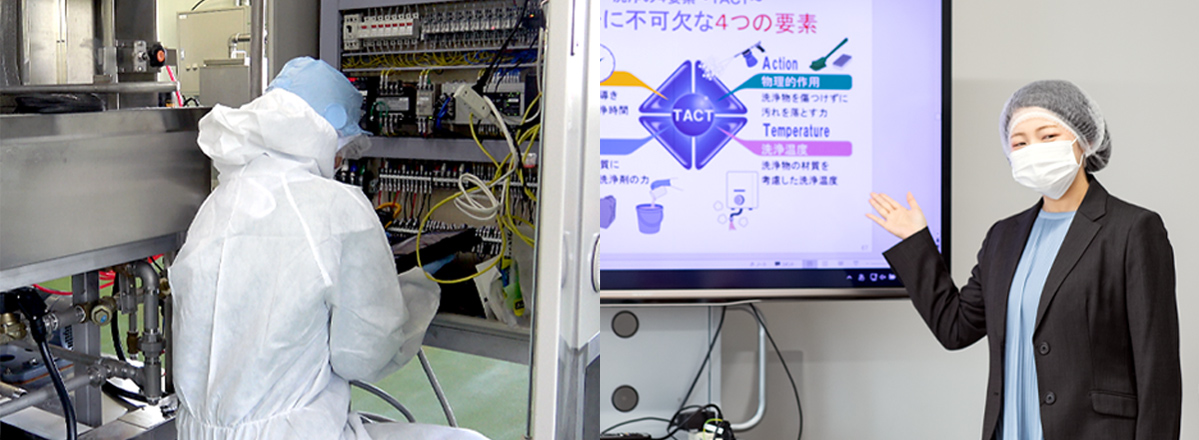全国の主要都市に拠点を設け、お客様のもとに迅速に駆けつける体制を整えています。最適な洗浄機、洗浄剤を提案する【営業グループ】、機械の不具合を解決する【修理グループ】、衛生課題を解決する【サニテーショングループ】、最適な洗浄がいつまでも維持されていくための【定期巡回グループ】を配置。各グループが連携し、地域密着で衛生に関する様々なニーズ・お悩みにお応えいたします。